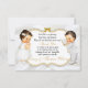Härlig tvilling- pojke & flicka i deras arga halsband för för christeningklänning och guld. Inbjudanbakgrund är vitsatäng med en guld- och silverglitterram och pilbågesmyckning. Baksida smyckas med det guld- blommamönster & guldbandet på en vitsatängbakgrund.
