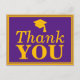Skicka ut detta Tack-kort med lila guld graduerings mössa till alla som stödde och uppmuntrade din skolgång. Det har en graduerings mössa och ett klassiskt teckensnitt i slående guld och lila skol färger. Skriv ditt personliga brev på baksidan.