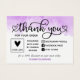Tack för att du har köpt in paket i en söt design med ett söt skript som dekorerats med hjärtan mot en vattenfärg som tvättar i lila. Anpassa med företagets logotyp och dina mediekonton i social. Du kan också skriva av en rabattkod för dina kunders nästa köp.