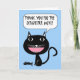 Tack för att du fick ett kort för att tacka någon för en underbar måltid och gästfrihet. En tecknad som illustrerar en svart katt med fiskskelett vid dess fötter. Stiliserad design i svart, vitt, rosa och blått. Ljusblå bakgrund. Bild och versa © Shoaff Ballanger Studios / 2015.