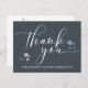 Det här vykortet för söt har modern kalligrafi "tack" med grafiska blommor som täcker mörk blått. På baksidan av vykortet anpassar du meddelandet eller tar bort texten för ett handskrivet meddelande. Berätta om du behöver hjälp eller har speciella förfrågningar.