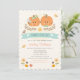 En söt och vismisk thanksgiving träffade inbjudningskort för möhippan med ett par söta pumpor som håller händer. Den brud som ska vara bär på en grönt polka punkt löv och har en bukett med daisy i händer medan hennes stiliga groom som ska vara bär en matchande polka punkt löv bowtie. Löv för akorns, svamp, brunrobin och gult och orange och en komplementär vattenbanderoll med hjärtan gör denna perfekt för en fall- och hösttematerad möhippa. "Tack för Kärlek"-teckning © Chrissy H. Studios, LLC. Alla höger reserverade.