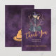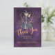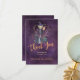 eleganten chic Halloween orange och lila möhippa för vattenfärgstypografi - tack vare din kortmall som innehåller en häxa i en grått-kolklänning och hatt med en borst och brushwood. Lämplig för Halloween-häxad häxtemad möhippa.