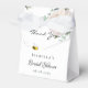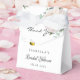 Både klassisk och söt för en möhippa. Chic vit bakgrund som dekorerats med vattenfärgade vita peonier, eukalyptus grenery och ett lycklig-leende bin. Med texten: Möhippa och Tack skriven med ett modernt skript för svart färgad i stil. Anpassa och bruden till namn och ett datum.