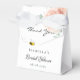 Både klassisk och söt för en möhippa. Chic vit bakgrund som dekorerats med vattenfärgad rosa och ro guld färgad rosor, blommigtar, blommor, eukalyptus greenery och ett lycklig-leende bin. Med texten: Möhippa och Tack skriven med ett modernt skript för svart färgad i stil. Anpassa och bruden till namn och ett datum.