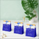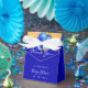 Royalets blå bakgrund färg. Dekorerad med fet guld glitter-droppar och blå ballonger. Anpassa och lägg till namn och datum. Modern hand skrev stil-skript.