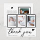 Ett modernt, minimalistiskt skript elegant med multifotogalleri nyfödd bebis födelsemeddelande och tack för babydusch med ett handskrivet "tack"-kort som slutar med ett boho-hjärta, tre lodränas foto i svart ramar, med baby namn och födelsedatum i enkel typografi. Baksidan har ett anpassningsbar-meddelande och ett annat foto. Klicka på redigeringsknappen om du vill anpassa den här moderna eleganten.