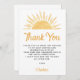 Denna sol-tema pojkens baby shower tackkort har en gul akvarell sol och stilren typografi. Lätt att anpassa. Baksidan är dekorerad med ett solmönster. Original Akvarell © Michele Davies.
