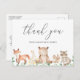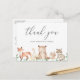 Cute Baby Shower Tack Postcard med en vattenfärgad målad scen med trädjur i en skog och "tack" i ett visstiskt skript tillsammans med ditt namn. Baksidan har ditt personlig-meddelande som gör det enkelt och snabbt att skicka ut ditt tack. Den här strålande babyduschen tack vare ditt vykort är könsneutral, så det är underbart om du har en pojke eller en flicka.