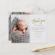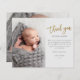 Det här moderna fotofotot-tackkortet har ett guld-skript tack, ett personligt meddelande och ett lodrät foto på framsidan. Baksidan innehåller ett andra foto från baby som är ett fullt-utfallsfoto för vågrät.
