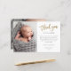 Det här moderna fotofotot-tackkortet har ett guld-skript tack, ett personligt meddelande och ett lodrät foto på framsidan. Baksidan innehåller ett andra foto från baby som är ett fullt-utfallsfoto för vågrät.