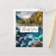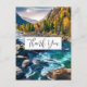 Tack-kort med ett vackert fotografi som visar trädbevuxna berg i höstfärger. En flod flyter runt stenar. En stor vit fullmåne svävar ovanför.