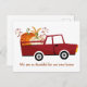 Ett vykort för flytta av söt Thanksgiving med en roligt röd gård lastbil som transporterar pumpor från ett fallpumpfack. Vi har ett nytt hem i höst med festrött och orange färg. Ett klassligt helgdag byte av adress vykort.