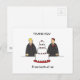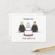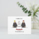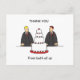 En enkel illustration av två brudgummar som står vid en stor tårta och orden 'Tack från oss båda'. Bilden är mot en vit bakgrund.