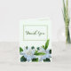 Tackkort-kort med trädgårdsblommor. Blekens grönt, vikbara kort med två vita gardiner och grönt löv. "Tack" på framsidan och meddelandet inuti är elegantens skriptteckensnitt och är enkelt att ändra. Använda till duschar, födelsedagspresent, bröllopsgåvor eller till tillfälle.