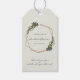 Modern boho-möhippa-favärde-tagg med ditt namn, din titel och ditt datum inuti ett guld-geometriskt ram omgivet av gröna och vita blommor. Nedan följer ditt personlig tack till ditt budskap. En botanisk design som är perfekt för ett bohemiskt firande under sommaren. Ram: a) Designad av Freepik<a href="http://www.freepik.com">