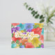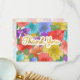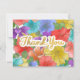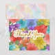 Falsk guld folie Handskriven Skrift Tack på roliga, ljusa och flerfärgade vattenfärg blommor målade av Suki’s. Stora blommor fyller hela designen och skapar en abstrakt färgblandning, men om man tittar noga visar varje blomma sin form.