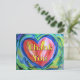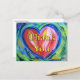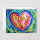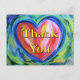 Textmeddelandet på vykortet lyder "Tack". Målningen visar ett färggrant rött hjärta med inslag av vitt och guldblekningar. Hjärtat är konturerat i blått och har en mjuk grön bakgrund. Denna hjärtamålning är en hyllning till att hålla hoppet kvar i ditt hjärta när den sorgsna bluesången omger dig, men ändå tar sig igenom för en grön förnyelse.
