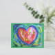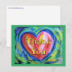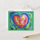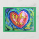 Postkortets meddelande lyder "Tack". Målningen visar ett färggrant rött hjärta med inslag av vitt och guldbetoningar. Hjärtat är konturerat i blått och har en mjuk grön bakgrund. Denna hjärtamålning är en hyllning till att hålla hoppet kvar i ditt hjärta när de sorgsna blueskenar omger dig men ändå tar sig igenom för en grön förnyelse.