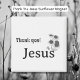 En modern svart-vit design med en enkel illustration av solblommor i teckning, med texten "Tack, Jesus". Retro-stil typografi.
