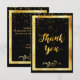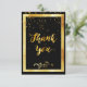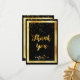 Svart bakgrund och en ram i guld. Gyllene konfetti som faller. Framsida: En handskriven text och orden: Tack! och en blomsterdekoration i guld. Baksida: Mall för din tacknota och namn