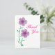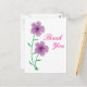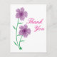 Enkel, söt lila blommor-design till lämnad om kortet på vit bakgrund. Rosa text som läser "Tack" till kortets höger.