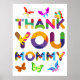 Tack-Mamma-dekorativ textbild mot den vita bakgrunden. Sex färgstarka fjädrar flyter runt bilden eller sitter på ett brev. Ett anpassade poster dekorera ställe och +fira Mors dag, födelsedag eller något annat tillfälle. Du kan byta fjärilar och ställe några foton istället för dem. Använda knappen "Anpassa" om du vill ändra textbildens storlek, flytta fjärilar eller ändra bakgrundens färg. Ha roligt, anpassa och köpa en och vara lycklig!
