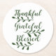 Tack, tacksam, välsignad, modern skripttypografi omgiven av löv, höst löv grafik, anpassningsbar text, namn söta elegant Thanksgiving Party pappra underlägg. Fullständigt anpassade mörk grönt text på vit bakgrund, tillgänglig i olika storlekar och former.