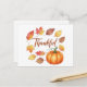 Skicka varmt höst-önskemål med det här charmerande vykortet "Thankful" helgdag, som innehåller en rustik pumpa omgiven av vibrant höst löv. Perfekt för Thanksgiving hälsning, säsong eller bara för att dela tacksamhet med nära och kära.
