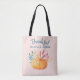 En tote med typografi som säger: Tack och lov, perfekt för thanksgivingen. En bild av en vattenfärgspumpa med orange och höst löv och spritar. Rosa och guld strimlade mönster mot bakgrunden.