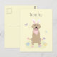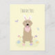 En söt illustration av en golden retriever hund som bär kaninöron och en söt påskbandana. Omgiven av dekorerade påskägg, vårblommor och fjärilar.