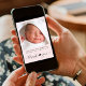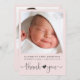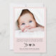 En söt rosa flicka tackar dig för ditt födelsemeddelande. Framsidan visar hennes foto, namn, ankomstdatum och födelsestatus, och tack i ett mjukt grått-skript med ett hjärta som går med de två ord. På motsatt sida lägger du till ytterligare ett foto, anpassar ett tackmeddelande och lägger till förälder och syskon namn i grått-typografi under en koordinerande söt pil med ett hjärta.