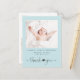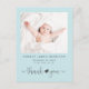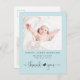 Ett enkelt och sött tack för gendernas neutralt för att du har ett vykort för födelsemeddelande med modern mjuk grått-typografi mot en pastellblå bakgrund. Framsidan har ditt nyfödda baby-foto, fullt namn, ankomstdatum och födelsestatus, och "tack" är skrivet i ett snyggt med ett hjärta som går med de två ord. På baksidan av vykortet kan du lägga till ytterligare ett foto, ett tackmeddelande, och förälder och syskon namn under en söt samordningspil med ett hjärta i mitten.