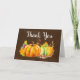 Ett tackkort med ett meddelande som du kan anpassa inuti. Designad med en vattenfärgad illustration av pumpor, akorner, svamp och säsong höst löv. Mörkens bruna vattenfärgsbakgrund.