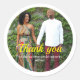 Runt "Tack"-märke med redigerbar text och ett foto som kan ändras för att göra det mer personlig.