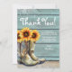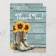 Tack Rustic Land Westerna solrosbollar har en vattenfärgad illustration av cowgirl-bots fyllda med solblommor med texten "Tack" i modern manustypografi och personlig med ditt anpassningsbar-meddelande nedan. Designad av Evco Studio www.zazzle.com/store/evcostudio