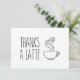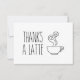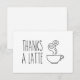 Den här fina 5 x 3,5 tum tacksamma ditt kort innehåller text som säger "Tack A Latte" med en söt liten bild av en kopp kaffe bredvid den. Kortet är platt så att en personlig anteckning kan skrivas på baksidan.