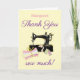 En snyggt vintage som syrar maskin med söt och trådar på en blek citronbakgrund, med texten " Tack så mycket!" Ett roligt att säga tack från / till en sömmerskare eller ett kylskåp. Perfekt för vänteläge eller sygrupp.