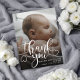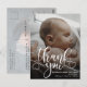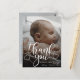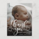 Modern Foto Bebis Födelse Annonsering Postkort. Design med tack skript, ett foto av barnet, födelse statistik, datum och ett namn på framsidan. Anpassa med ett annat foto och ditt tack meddelande på baksidan.