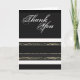 "Tack-kort" för alla tillfällen med anpassningsbara textmallar. DESIGN ~ Den övre halvan av detta vertikala kort är svart och har orden "tack" i vitt emot den. Ligger på den nedre halvan är släta och strukturerade horisontella ränder i svart och vitt och två blommiga spetsinfällningar. ANPASSA ~ Ändra formuleringen för att passa tillfället och använd knappen "anpassa" för att lägga till eller ta bort textmallar.