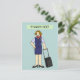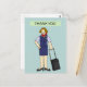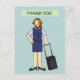 En kvinnlig flygassistent står med en liten svart resa fodral. Ord "Tack" står ovanför bilden, som har en blek blå bakgrund.