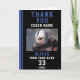 Tack Tränare Fotbollsspelare Lag Fotokort. Lägg till tränarens namn, spelarens namn, lag, nummer och spelarens foto. Texten är trendig vit och blå typografi på en svart bakgrund med blå rand.