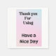 Denna napkin används ofta vid särskilda tillfällen som party, bröllop, helgdagar eller företagsevenemang där tacksamhet uttrycks. Snyggten skrivs vanligtvis ut i ett typsnitt, och kapslingen i sig kan ha kom i olika färg, med utskriften ofta i kontrasterande skuggor för att få meddelandet att framträda. Napkin är praktisk och dekorativ och tillför en tankfull beröring till alla händelser.