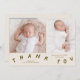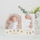 Kortet för anmälan om missförstånd vid födseln med typografi som säger "tack" vid grund med två foton på typsnittet. Du kan lägga till en tredje bild på baksidan tillsammans med födelsestatistik och födelsemeddelande. Bakgrunden är grädde.