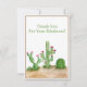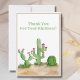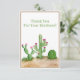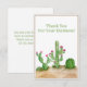 Ett charmerande vattenfärgskort "Tack" med ett vackert illustrerat kaktus i ett serenökenlandskap.