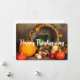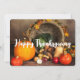 Ett platt kort med ett fotografi av en tackskördefest, placerat på ett rustikt trädgallerbord. Pumpa, potatis, squash osv... utgör denna rikliga samling mat. Färgglada höstlövar omger kornucopiakorgen.