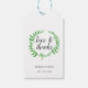De här botaniska presenterna för dina bröllopsfavoriter innehåller en lövning i grönten med vattenfärg med ditt budskap i kalligrafskript och din namn och bröllop dejt längs grund. Märkrna går tillbaka till solid grönt.