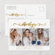 Elegant Modern Calligraphy Guld Script 3 Photo Collage Newborn Baby Tack Birth Notification Postcard. Innehåller en vacker "tack"-text i ett handskrivet skript för kalligrafi-byten mot svan-teckensnitt FAUX guld. På motsatt sida finns ett personligt meddelande. Underbar för pojke eller flicka. Enkel att anpassa med ditt baby-foto och din information.