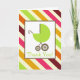 Ett barnduschkort som visar en illustration av en grönt baby-vagn över en bakgrund av diagonalt rand. Insidan är tom.