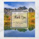 Party tackar er flaska-etiketter med ett vackert foto från land. Stenberg med ljusa färger höstskog. Ett tyst sjö avspeglar bergen, träd och gräset.